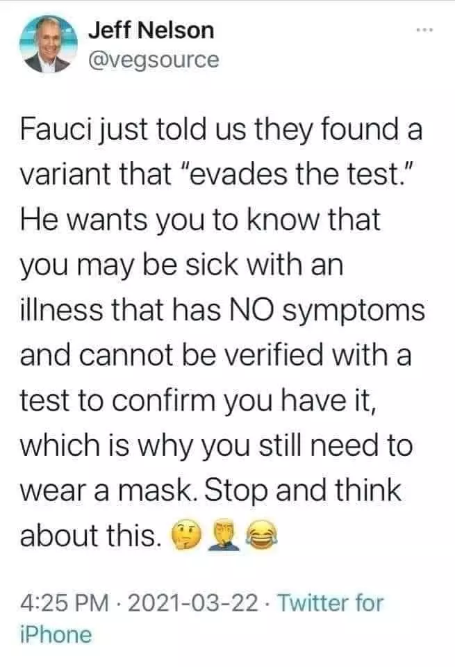 So not only are we in an endless cycle of doing whatever they tell us while they continue to roll out "mandates", but now we have to comply because they can't test for it? Seems like fear mongering to me. At the end of the day I would rather trust Jesus than any of these crazies.