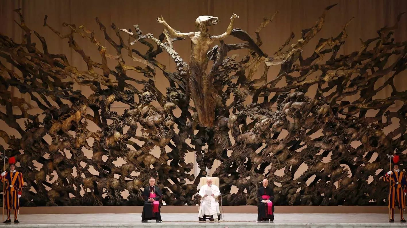 Does this look like a Christian piece of artwork to you? Does it make you want to become Caholic? I'd hope not. Looks quite demonic to me....and the pope is sitting in front of this monstrosity like absolutely nothing is wrong.