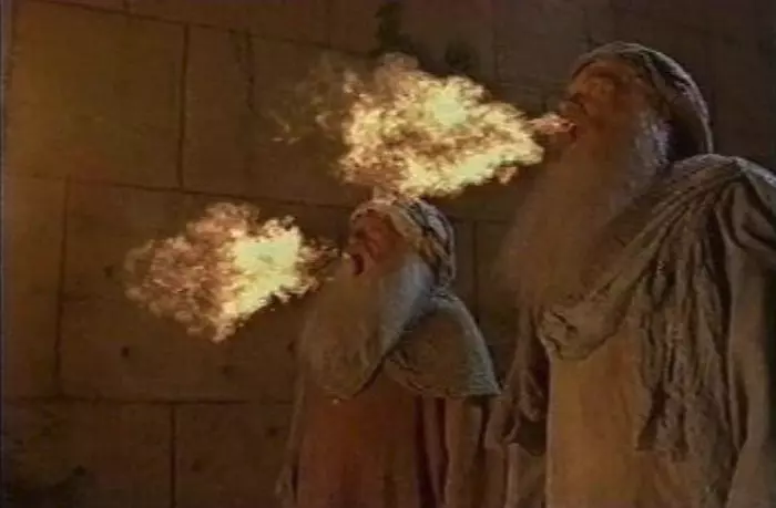 At the end of the New Testament, the curious narrative of the Two Witnesses comes into focus, and we again see this usage of the metaphor of fire. Rev. 11:5 reads that “if any many hurt them”, “fire proceeded out of their mouth” and “devoureth their enemies”. And this is the way their “enemies” are “killed”. Many believers find hope in to this passage because it feels like a moment of righteous retribution against the evil scoffers of God. The literalist dispensationalists actually imagine 2 characters such as Moses and Elijah blasting away the enemies of God by literally breathing fire from their mouths as seen in the famous (or infamous) Kirk Cameron film.