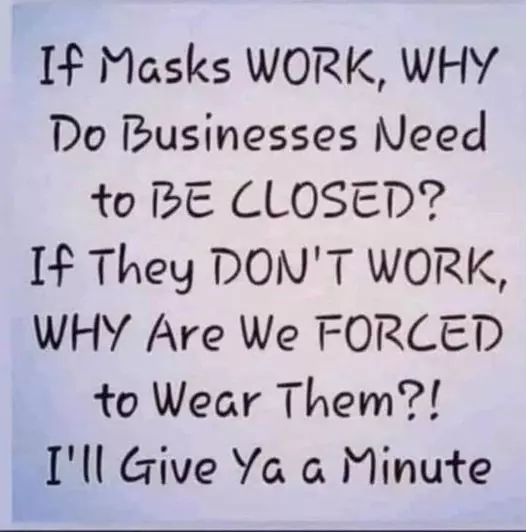 Masks that they force you to wear even though you can read on the boxes that they do not stop the virus from spreading. Then a vaccine that doesn't stop you from contracting the same virus it's supposed to be protecting against? I don't understand how people see how all this is just a complete FAILURE. Masks only for their rituals and maybe getting people sick from bacterial infections. Jabs to inject whatever man made chemicals into the human body to do who knows what? I don't know what it really does to it's full extent. Do you? I would say this is going to be really bad expecially if they had included the funvax into it.