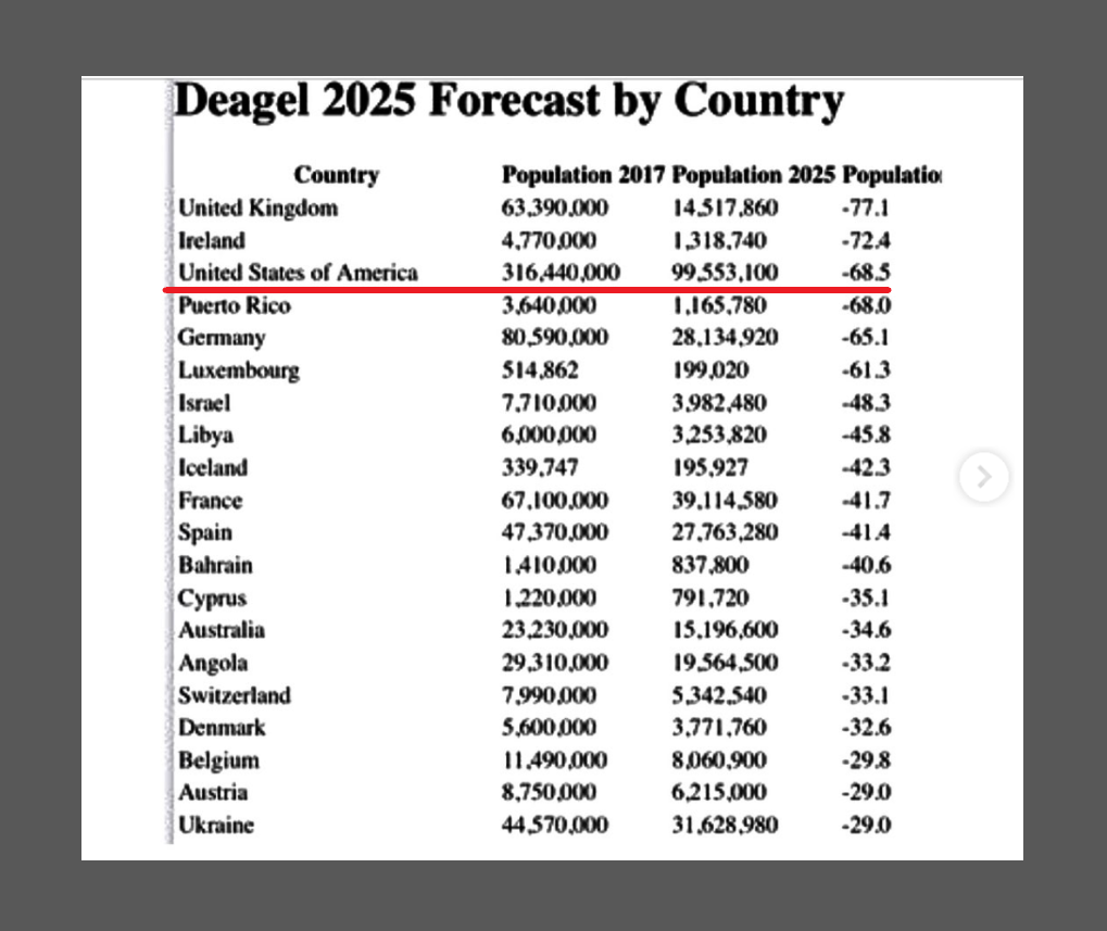 I am not, nor have I ever been a date-setter, but have felt for a considerable period of time now, that 2022-2025 are the pivotal years for humanity. Deagel predicted in 2020, that the United Kingdom would see its population decline by 77.1% by the year 2025," p. 171.