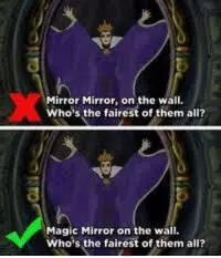 You said and I think all you out there said "mirror mirror on the wall". You're right but no longer. Now it says in the present reality "magic mirror on the wall". Check it out. We know it said "mirror mirror" right? Not now. Now that may seem trivial or silly and you may wonder what that has to do with anything but you'll see. Be patient and keep following.