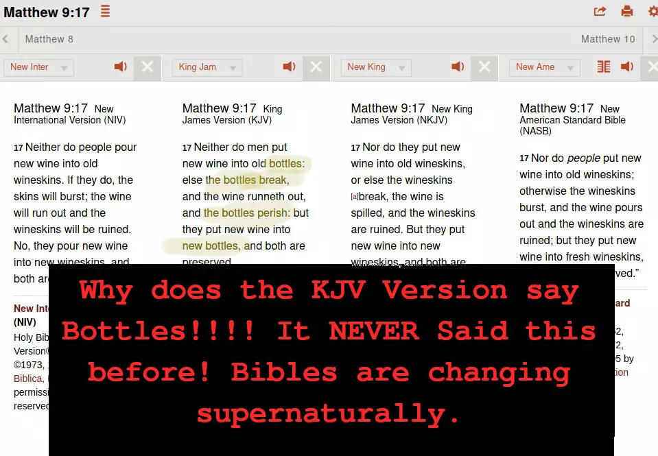 These issues seem to be specific to the KJV bible (AN: All bibles are changing supernaturally. The KJV is just the most altered at this point.) which we teach from. That's what we learned from under Dr. Scott because it was the best example of scripture although it is full of miss-translations. You'll also find it in Luke 5: 37.