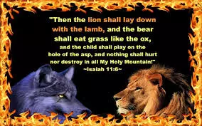 The Lion shall lay down with the lamb. Now in this reality it says "The wolf shall dwell with the lamb" and again like I said before CHECK IT OUT! Now lamb associates to Jesus and the Lion furthermore associates to Jesus who is the Lion of the tribe of Judah. The wolf usually associates with evil and with Satan as in scriptures that says "beware of wolves in sheep's clothing". I think we've all heard that.
