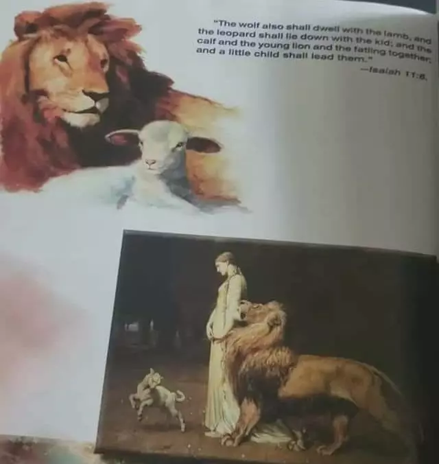 Why does this book say that the wolf will dwell with the lamb...but the picture shows a LION? It's because although the verse itself and the text has changed...the photo stayed the same!
