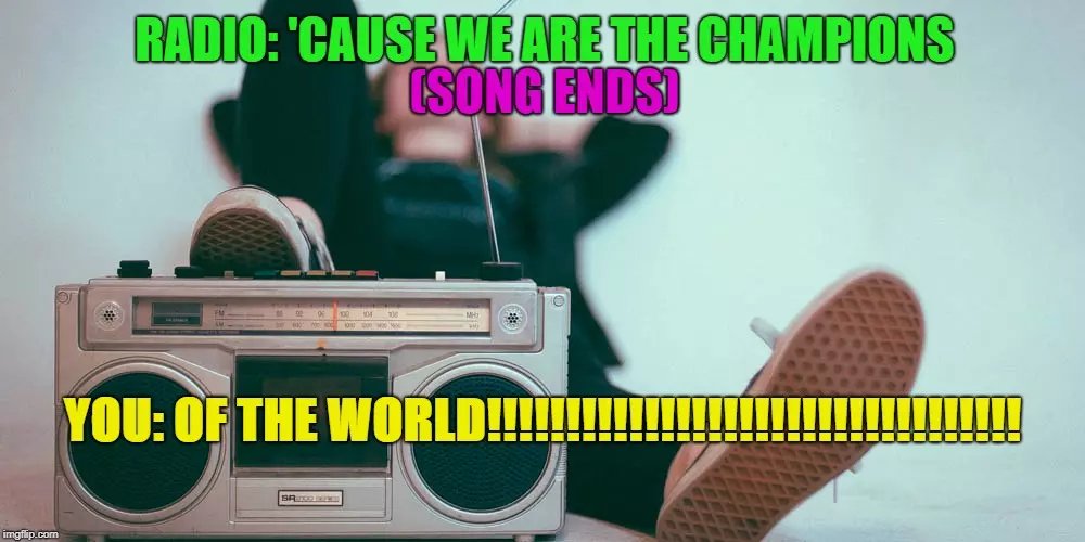 So I kept looking at examples. Then I see the Queen song "We are the champions". Now I know that at the end of the song it says "of the world". When I was little when wrestling came on when I was little I would run to the front room because me and my brother would start watching wrestling. Ok. I know it ended like that but now in this timeline it never ended like that.