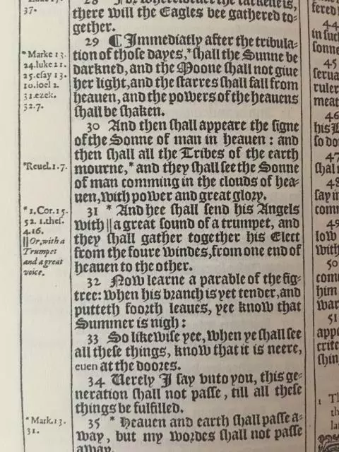 "See beside verse 31? This is my 1611 facsimile. Clear reference to thess 4:16."